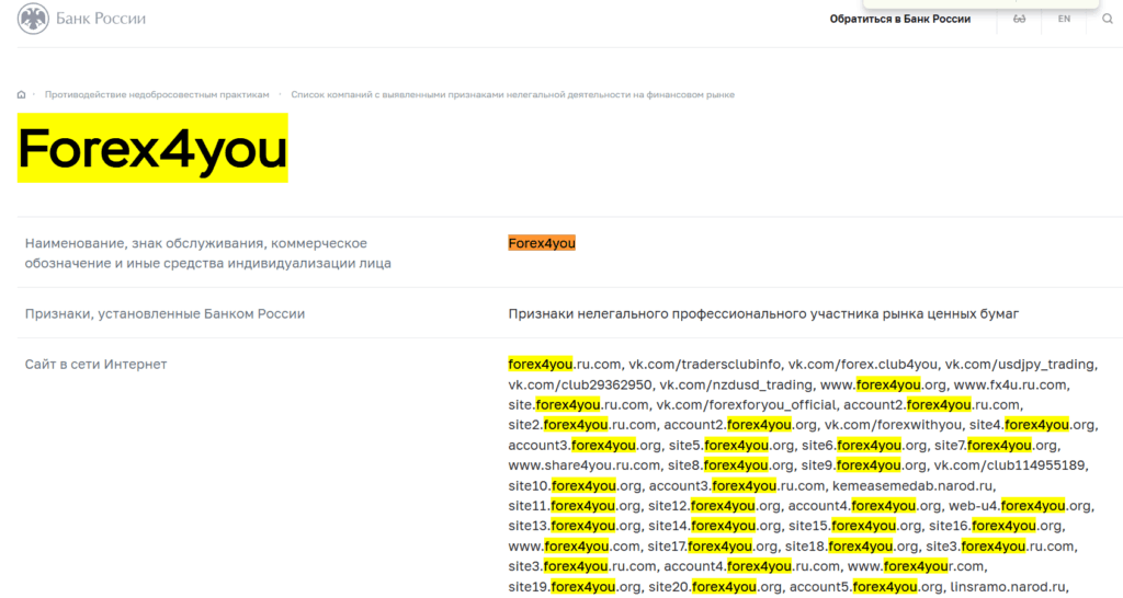 Более того, Центральный Банк Российской Федерации официально внес Forex4you в свой предупредительный список! Проверить это может любой желающий.